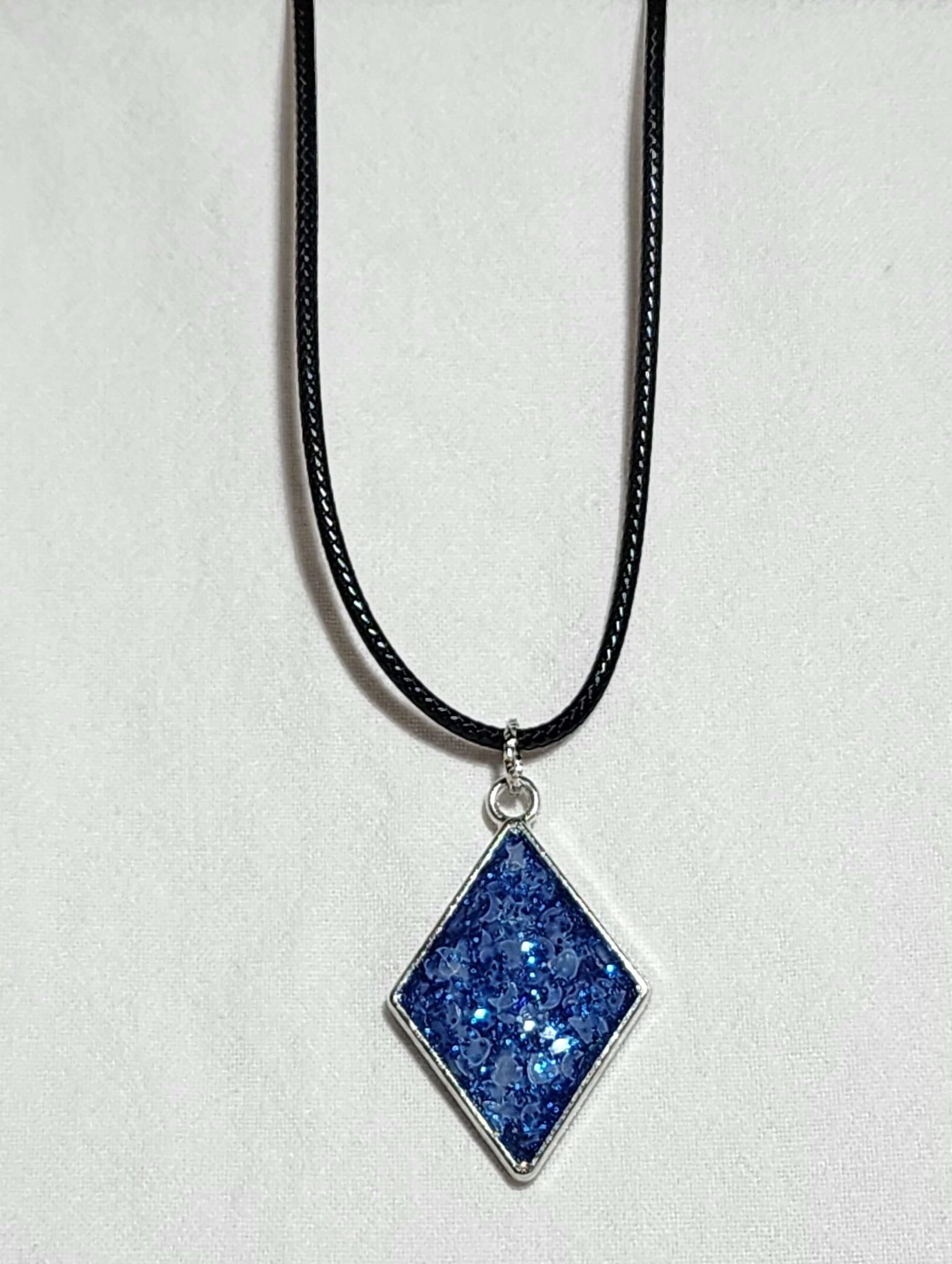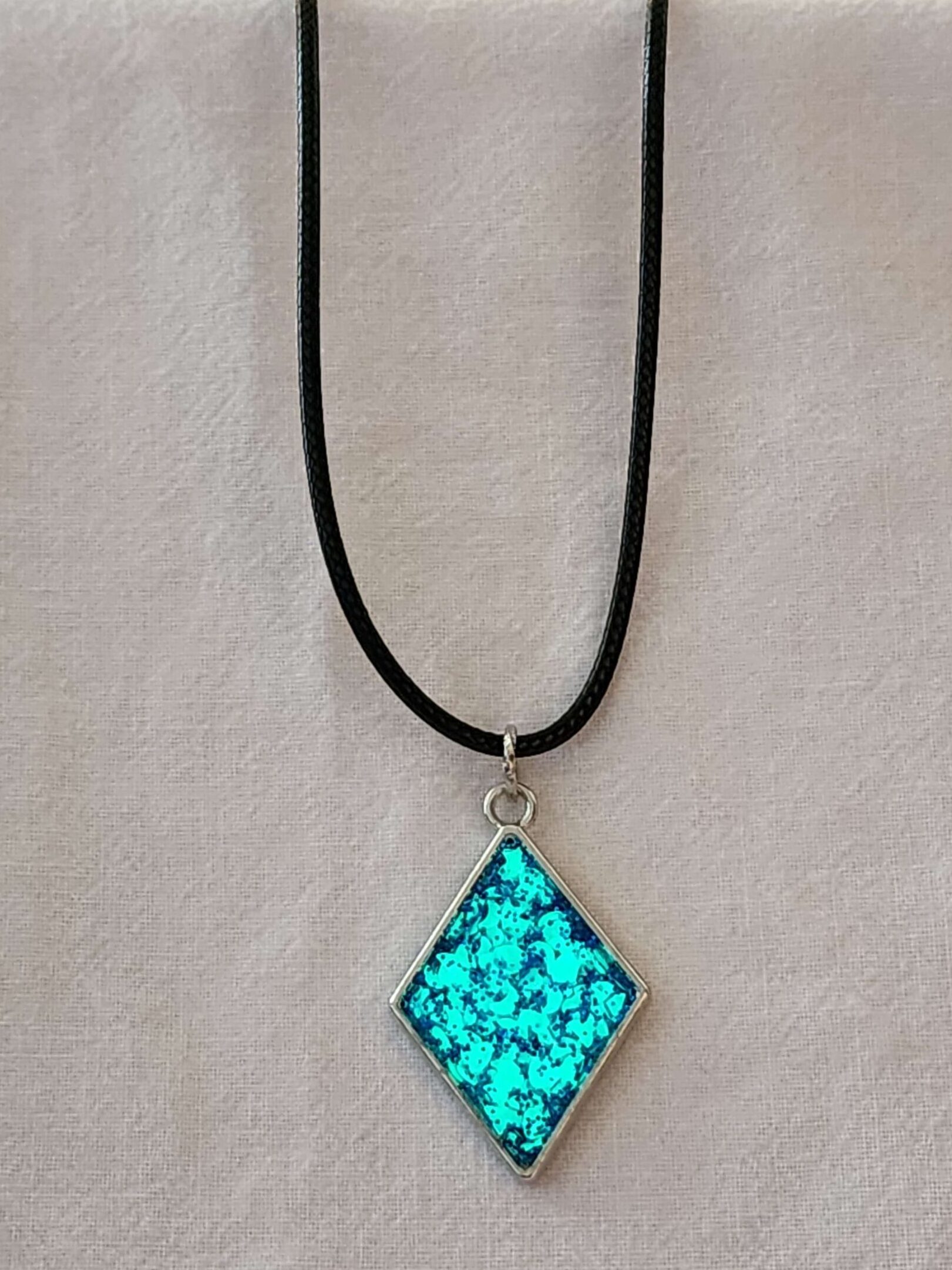 Resin filled diamond bezel necklace- Blue Glow-in-the-Dark, 24″ cord
