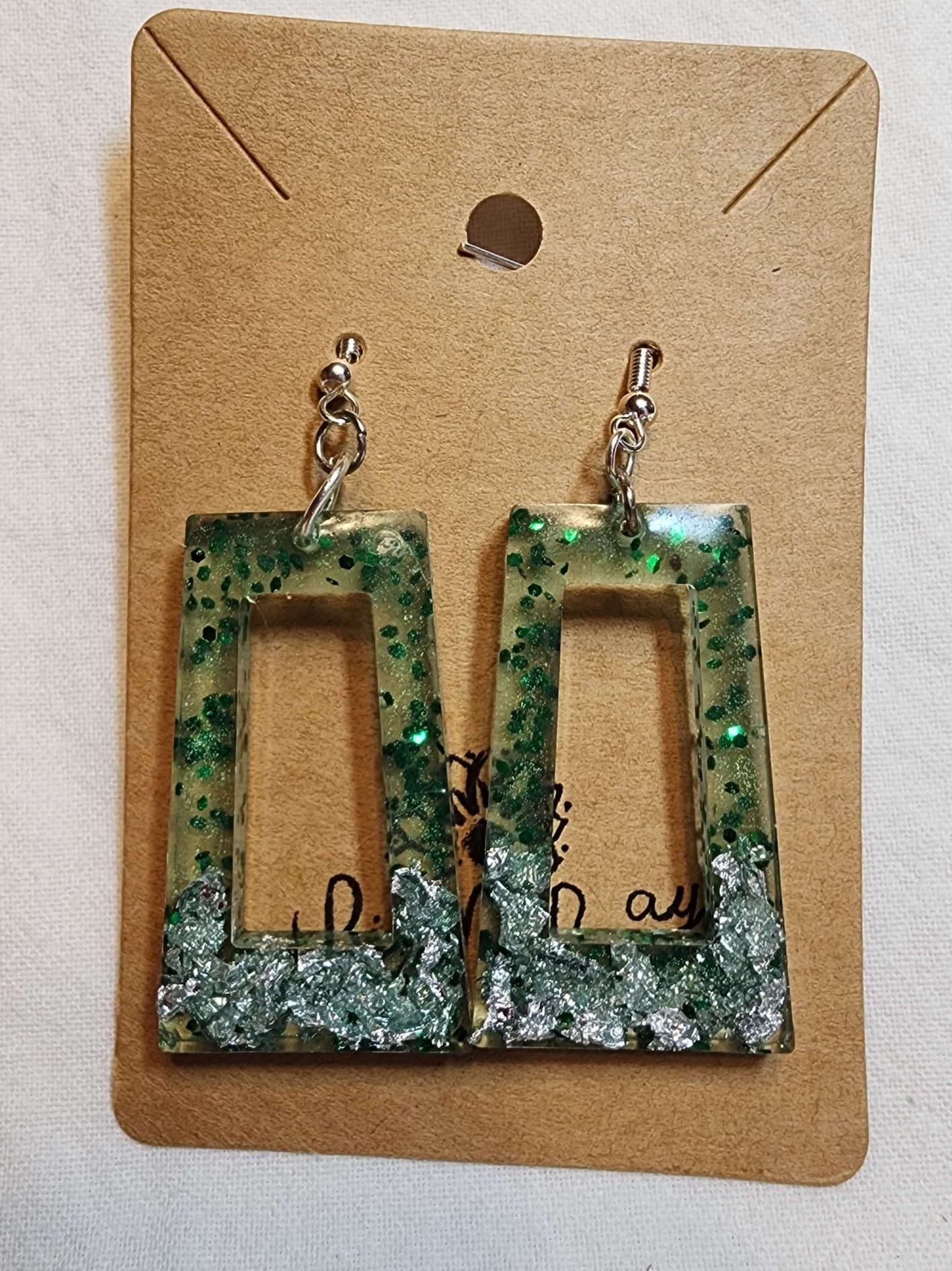 Resin with green glitter and silver foil flakes. Stainless steel hooks.
