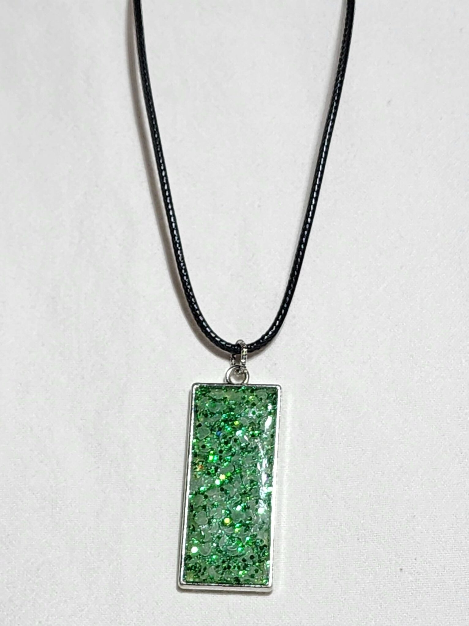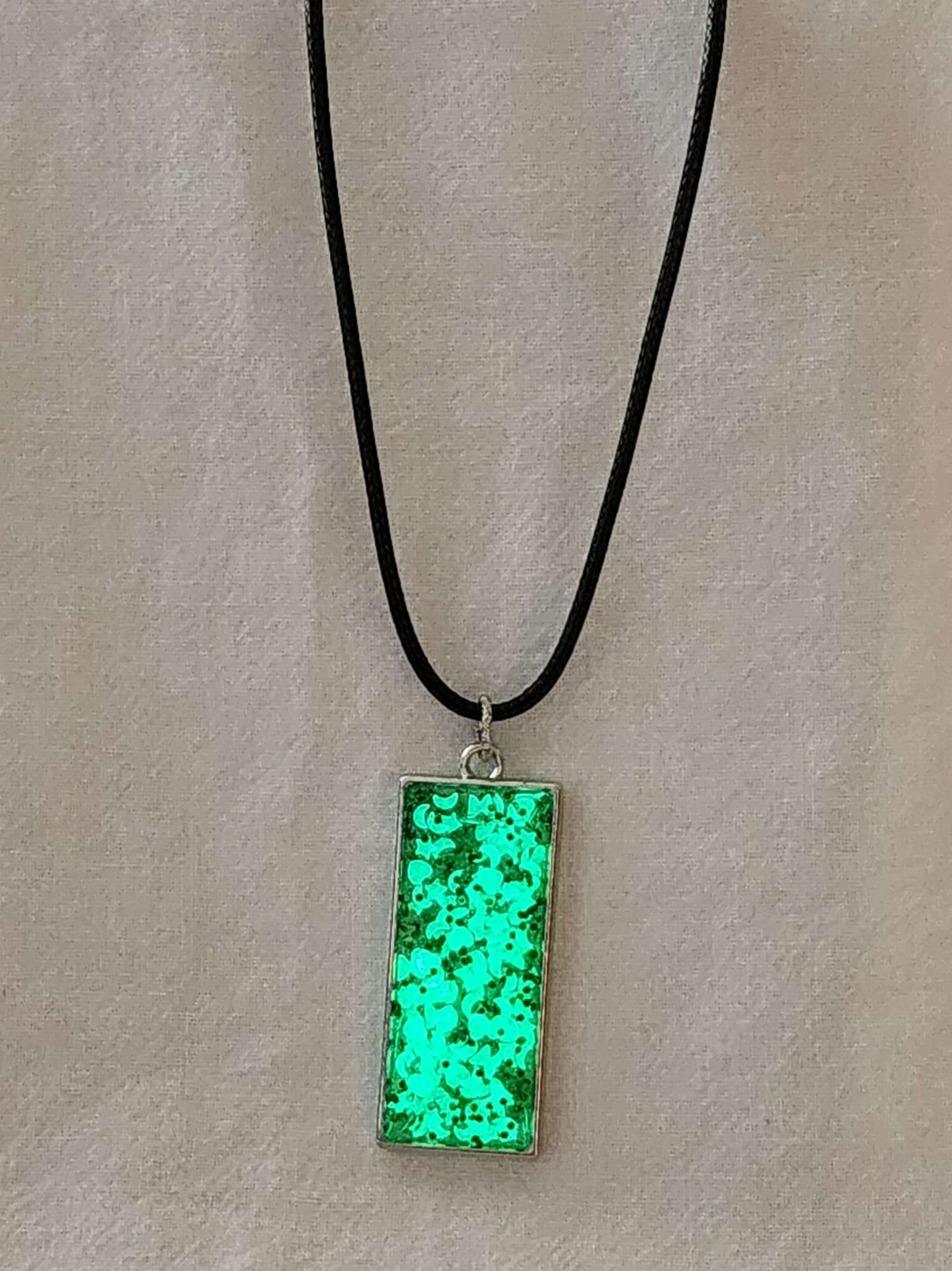 Resin filled Rectangle Bezel- Green with glow-in-the-dark inclusions, 24″ cord.