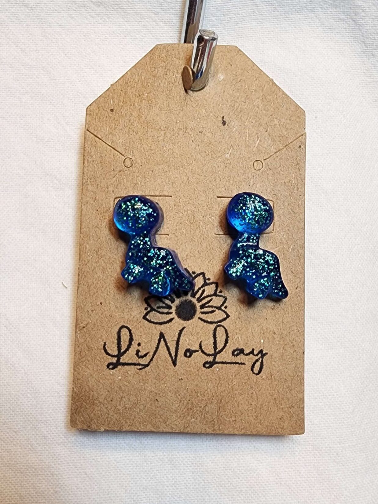 Resin Dino Studs made with blue resin and blue glitter. Stainless steel studs.